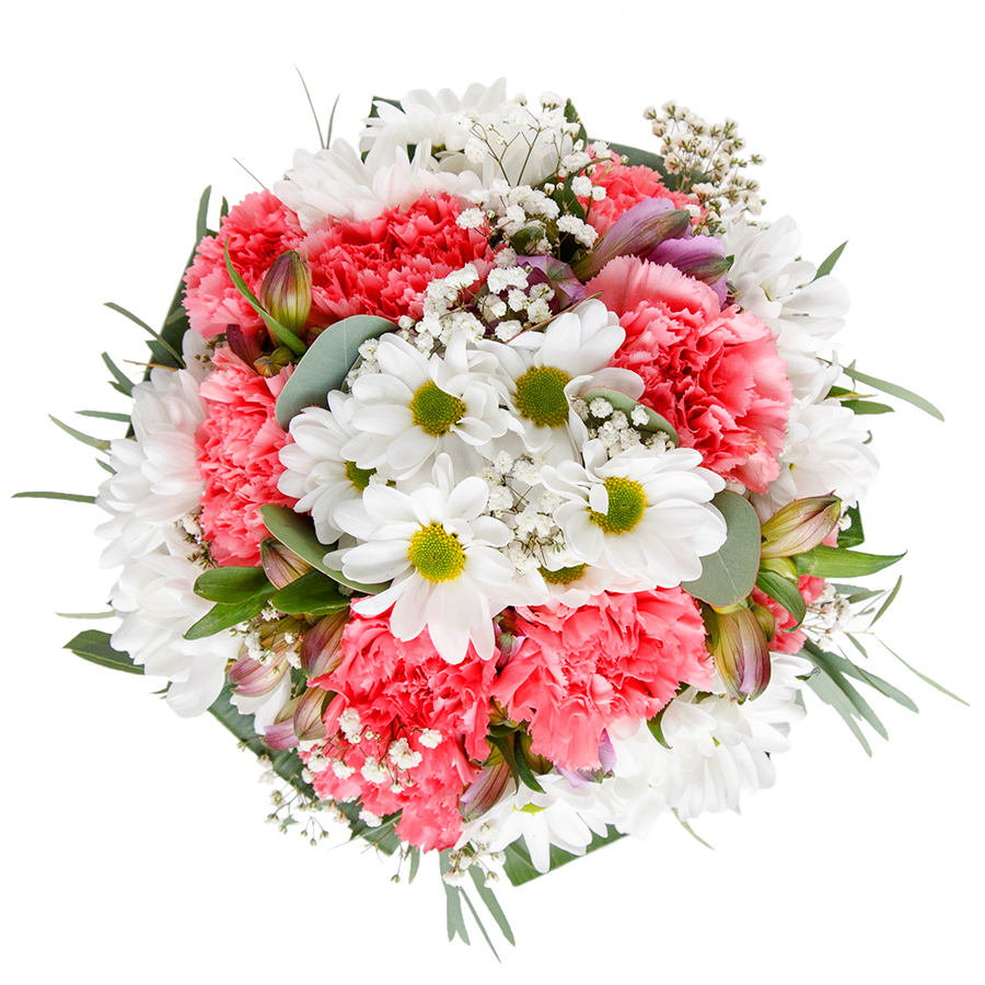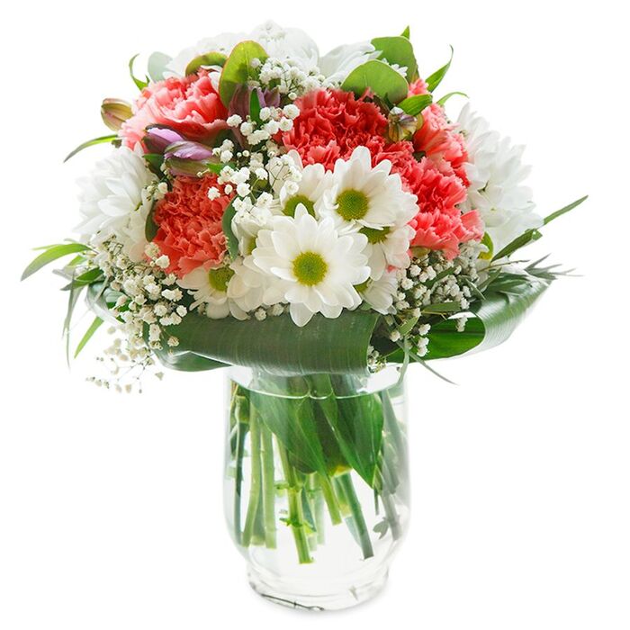 Express your love with our beautiful floral arrangement. This bouquet features a captivating mix of snow-white chrysanthemums, delicate gypsophila, and light pink carnations, elegantly intertwined with lush aspidistra leaves for a refined look.